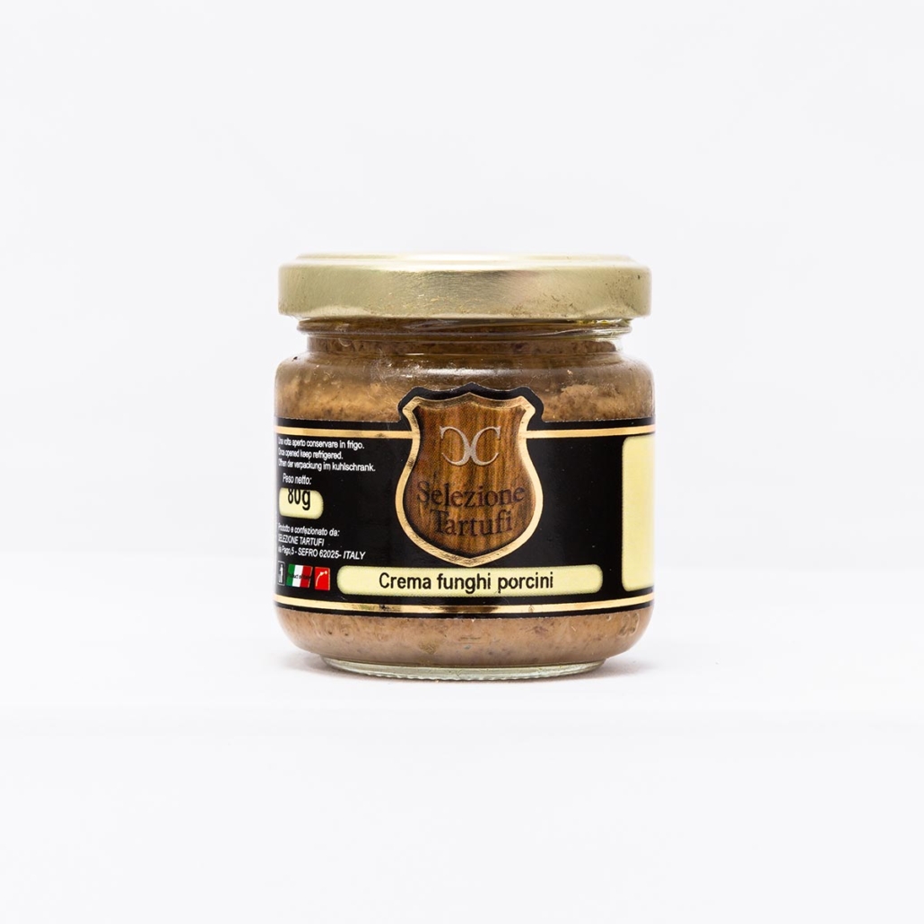 “PORCINI” MUSHROOMS CREAM: Cultivated mushrooms (Psalliota Hortensis) 55%, “PORCINI” mushrooms (Boletus Edulis e rel. group) at least 30%, mixed seed oil, cornstarch, salt garlic, pepper, parsley.